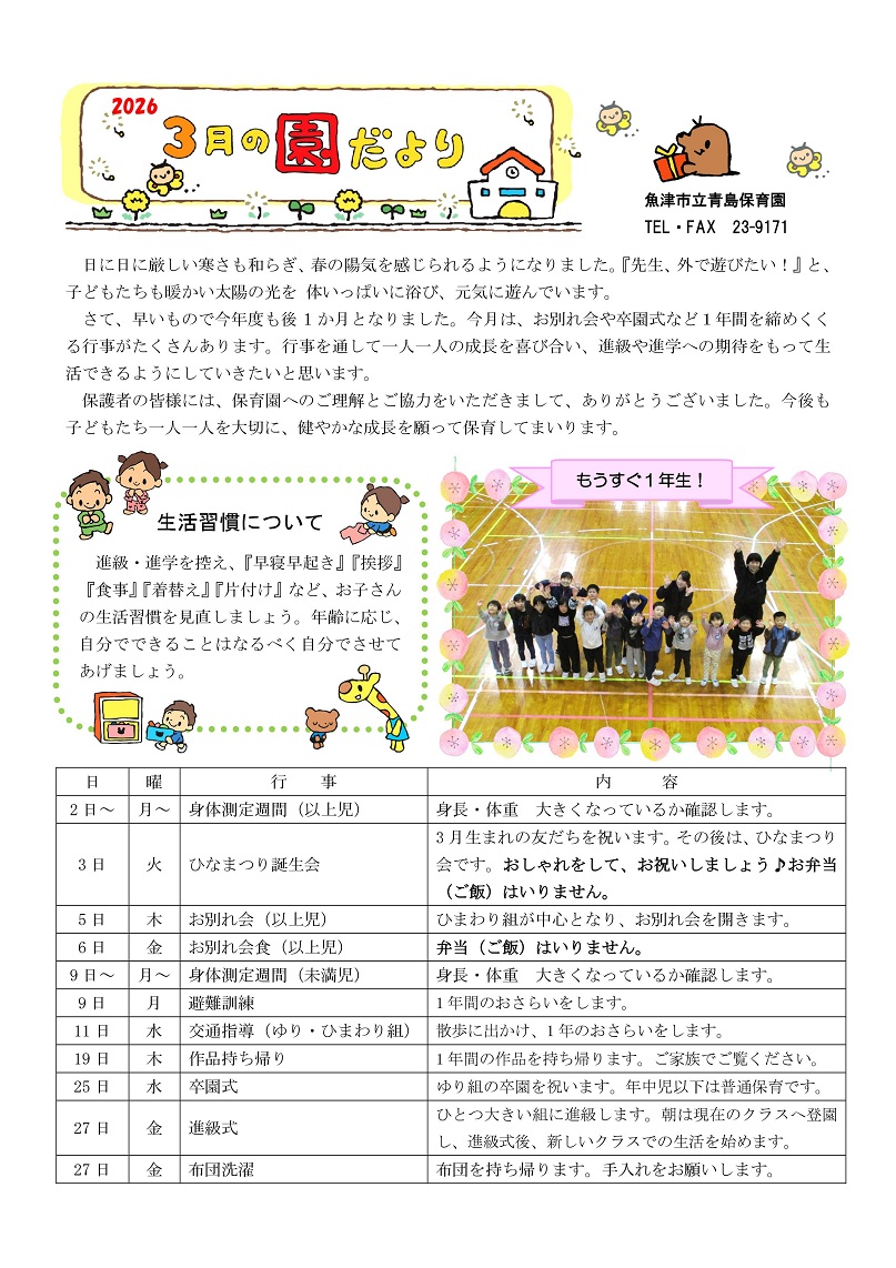 青島保育園の園だより(令和8年3月号)