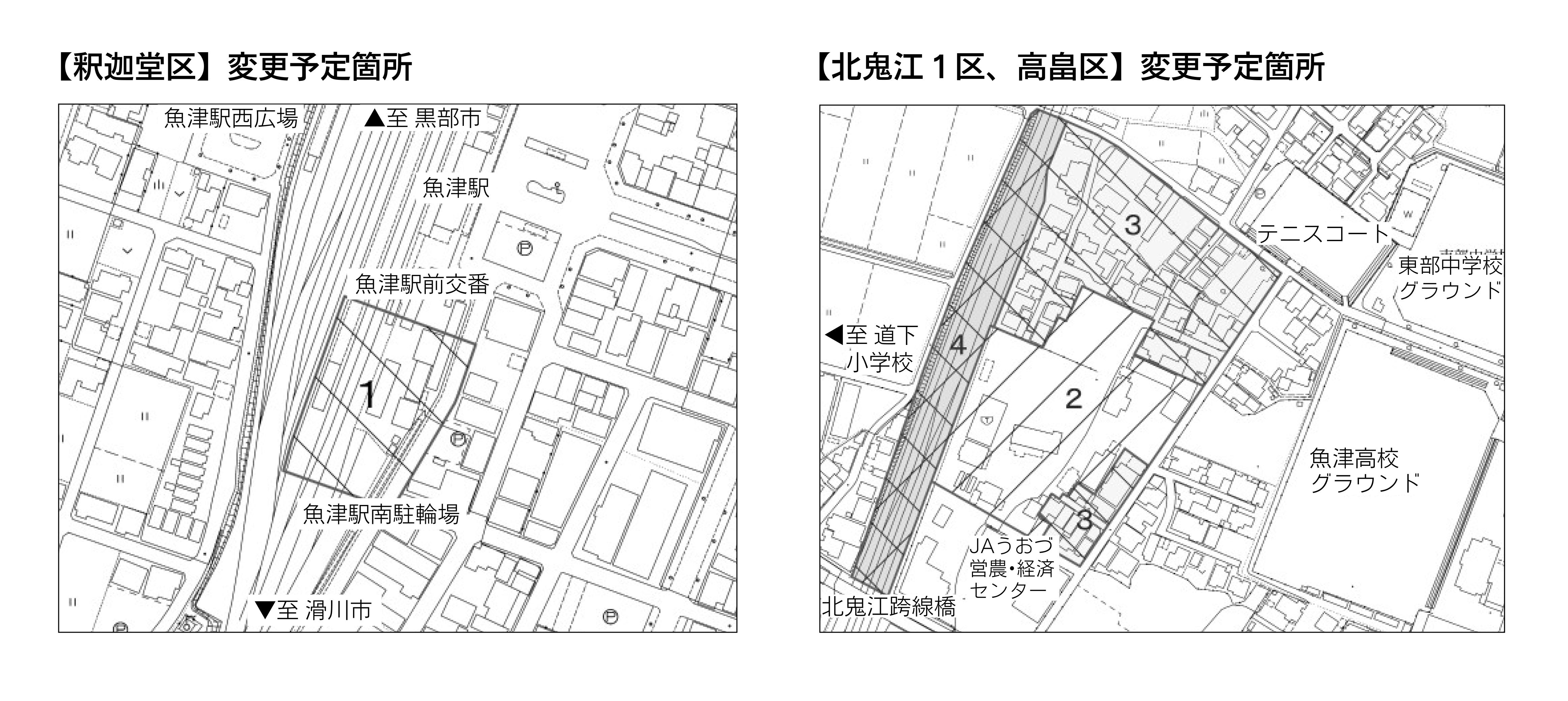 釈迦堂区の一部並びに北鬼江1区の一部及び高畠区の一部に関する都市計画(用途地域)の変更案の縦覧を行います。 変更案の箇所及び内容 今回の変更案の箇所及び内容は、次のとおりです。 変更案箇所 現状 変更案 1 第1種住居地域 容積率:200%建ぺい率:60% 商業地域 容積率:400%建ぺい率:80% 2 準工業地域 容積率:200%建ぺい率:60% 工業地域 容積率:200%建ぺい率:60% 3 第2種中高層住居専用地域 容積率:200%建ぺい率:60% 4 用途無指定地域 容積率:200%建ぺい率:60% ※この他、建築物の用途や高さなどの制限が変更となります。 縦覧期間及び縦覧場所 縦覧期間 令和8年1月8日(木)〜令和8年1月21日(水)縦覧場所 魚津市役所本庁3階 都市計画課 その他 1 変更案に対してご意見のある方は、都市計画課にある「意見書」を、令和8年1月20日(火)〜令和8年2月2日(月)の間に都市計画課まで提出してください。2 諸事情により、縦覧期間が変更となる場合があります。変更となる場合は、本ページにてお知らせしますので、ご確認をお願いします。
