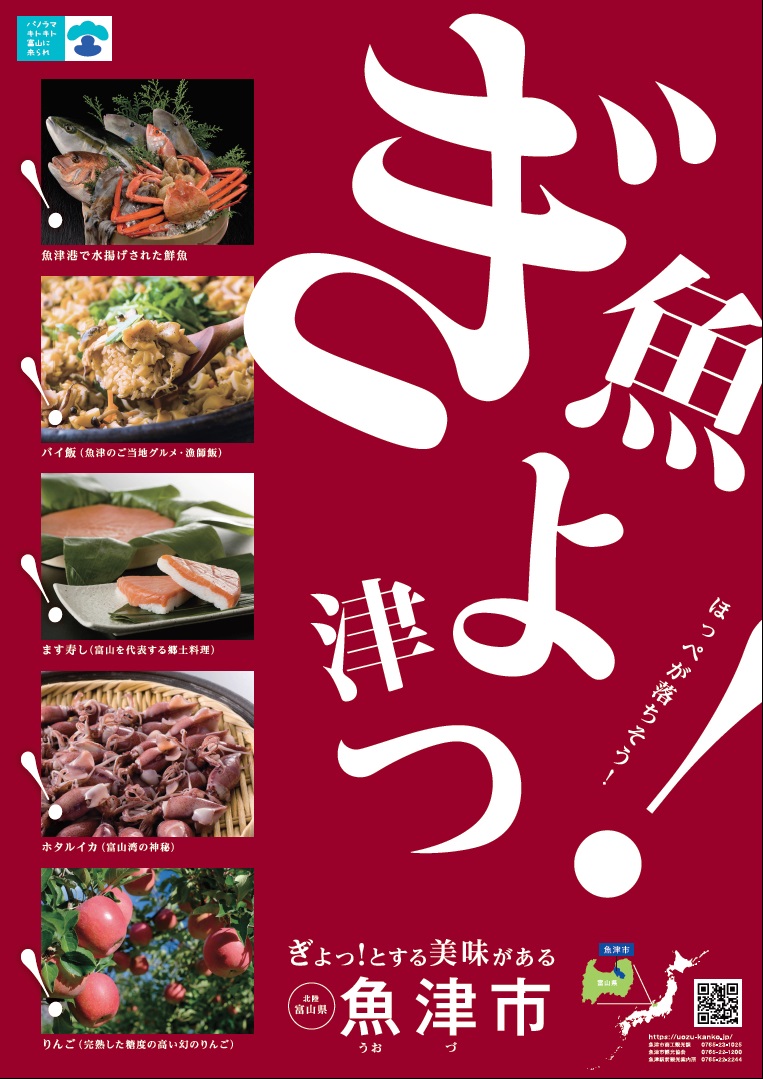 ◆構成 「魚津の食の魅力」と「自然・風景等の地域の魅力」を盛り込んだ2連組×2種類(4種類)と し、インパクトが強く市の認知度向上が期待され、視覚的に目に留まるような仕上がりとした。 ◆キャッチコピー 「ぎょっ!」/「海と山しかないです。だから美味しい/美しい…」 ◆ポスターサイズ B1サイズ ◆ポスターデザイン