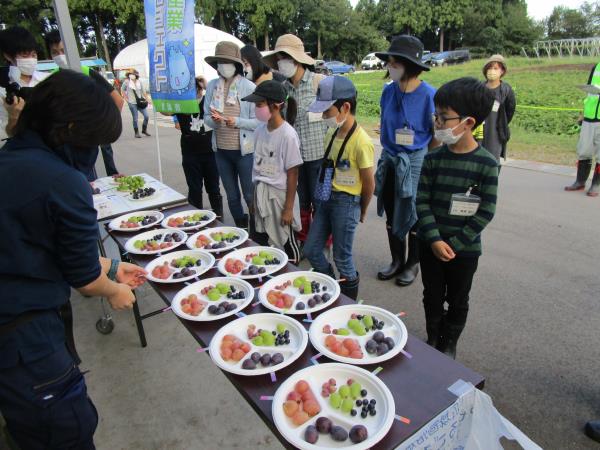 開催日 令和3(2021)年10月2日(土)午前10時〜 体験場所 ワインぶどう園地・さつまいも畑(小川寺地内) ぶどうのお話 ぶどう畑で「ぶどうの種類」について学習しました。ワイン用のぶどうです。いろいろなぶどうを試食してみます。 5種類のぶどう。 さつまいもを収穫しましょう 畝(土)の中にあるさつまいもを掘ります。トラクターだと楽です。みんなは、手で掘ります。がんばってください。掘ったいもは、収穫箱にいれます。たくさんのさつまいもです。さつまいもを持って、みんなで記念撮影です。 メインページに戻る
