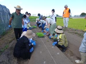 畑に行って、植え方を教わった後は、実際にはくさいの苗を植えました。先生は魚津市秋冬はくさい出荷協議会(うおづしはくさいしゅうとうしゅっかきょうぎかい)の方。はじめての体験(たいけん)ながら、みんな上手に植えていきます。